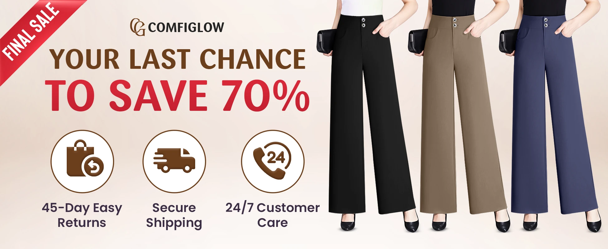 After 50, you deserve pants that care for you. ComfiGlow is soft on the skin, flattering at the waist, and effortless for every day. No squeezing, no sagging—just comfort that lets you move freely and confidence that makes you glow.